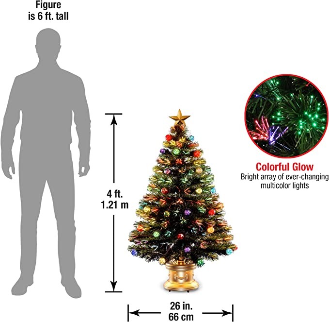 Transform your home into a winter wonderland with National Tree Company's Pre-Lit Artificial Christmas Tree. This majestic Evergreen tree is 4 feet tall and 26 inches in diameter at the bottom, making the tree perfect for entryways and tight spaces. Friends and family alike will marvel at how the tree closely mimics those outside. Made to look and feel lifelike, the stunning realism of the tree is defined by its close attention to detail, featuring hundreds of individually crafted branch tips that make up the wide, full-bodied branches that create space for your lights and ornaments. The tree is designed with a hinged branch system that allows the branches to swing down for a quick and simple set-up and fold back in for easy storage. Set aside 45-60 minutes after assembly to properly shape the tree by peeling back the branches and pulling the tips apart to give the branches a more full-bodied look. This fantastically festive tree is strung with multicolor fiber optic lights prior to packaging and includes a ornate, metal base for a more convenient setup. The lights operate individually, so if the bulb lens has not been cracked or broken, the light set will continue to illuminate except for any individual bulbs that are not working. Before dressing the tree in twinkling lights and glistening ornaments, consider placing it in a living room or dining area where it can be viewed from multiple angles and does not block any entryways. Constructed with sturdy, high quality materials and hypo-allergenic, fire-resistant needles, this tree is built to bring holiday cheer for years to come. At National Tree Company, we strive to create high quality Christmas decorations to help you transform your home so you can keep making every holiday moment magical.