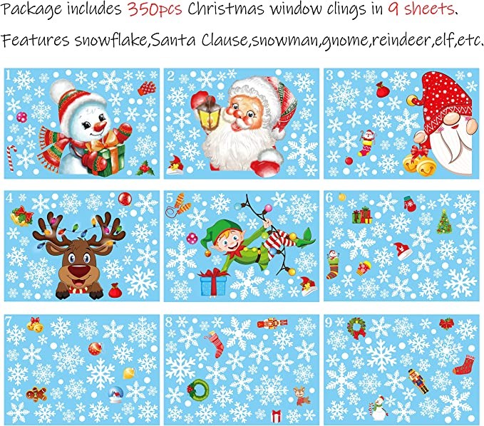 350PCS Christmas Decorations Snowflakes Window Clings Vintage Xmas Winter Decals Santa Clause Gnome Elf Snowman Reindeer Party Cling Decor
