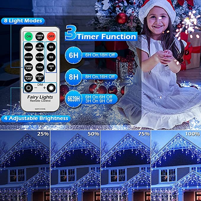 Use the remote control to adjust the brightness, this LED Christmas icicle lights will meet your different demands.